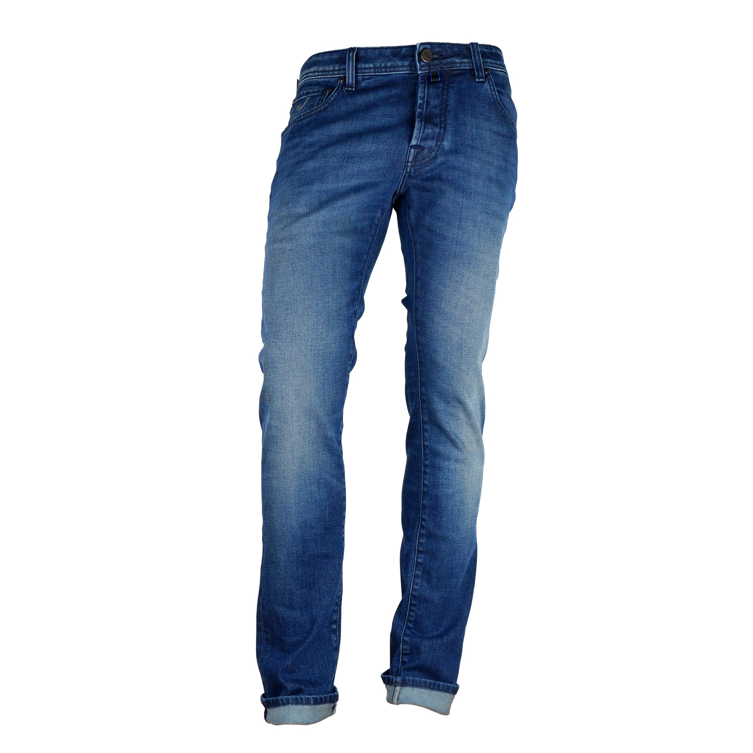 Jacob Cohen denim, blue color, five-pocket design, leather patch on the back, button closure on the front, regular fit. Made in Italy