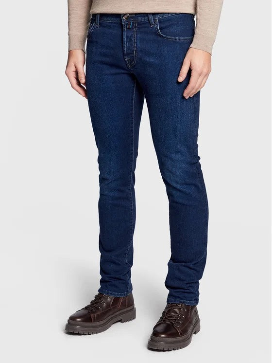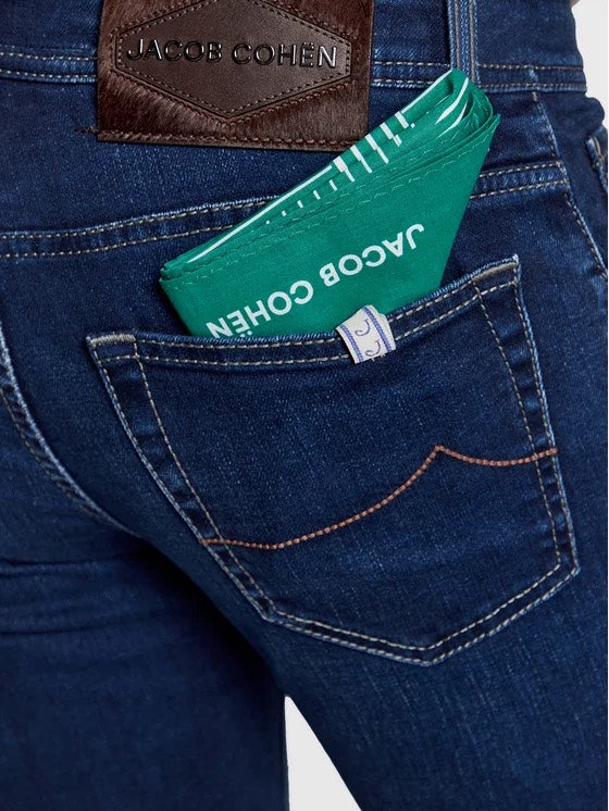 Jacob Cohen denim, blue color, five-pocket design, suede patch on the back, button closure on the front, regular fit. Made in Italy